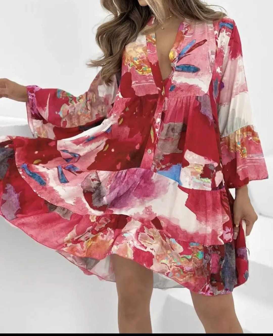 Elevate your wardrobe with this stunning abstract floral print mini dress, designed to make a bold yet elegant statement. Featuring a vibrant blend of rich reds, pinks, creams, purples, and hints of vivid blue, this dress showcases a unique watercolor-inspired pattern for a modern artistic vibe. Crafted from lightweight, breathable fabric, it offers exceptional comfort and flowy movement—perfect for warm-weather outings or stylish vacation wear. The relaxed, A-line silhouette flatters all body types, while the tiered skirt and long bell sleeves add a touch of femininity and boho flair. A partial button-down front enhances the dress's versatility and adds to its casual-chic appeal. The V-neckline elongates the neck, offering a delicate touch that suits both daytime and evening styling. Whether dressed up with heels or paired with sandals for a laid-back look, this dress blends fashion-forward design with everyday comfort—ideal for brunches, beach days, or spontaneous getaways. A must-have addition to any fashion-savvy wardrobe.